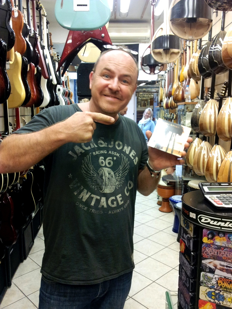 Yiorgos, patron du célèbre Guitar Shop (à Polydorou), l’un des magasins de guitares les plus visités et les plus « en vue » de la capitale grecque, a réalisé une sympathique promotion du disque. De nombreux exemplaires ont été offerts aux meilleurs clients et à ceux qui ont acheté ce jour là une belle guitare Fender ou autre. Les 3 titres ont été passés en boucle et les gens ont adoré ! Ci-dessous un touriste allemand, incroyable « réseauteur », dans la boutique.