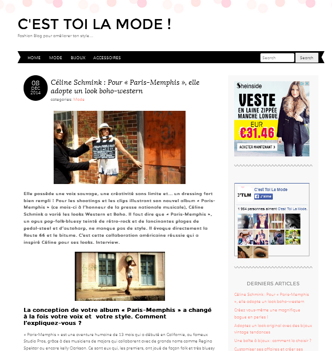 ACTU du 11 décembre 2015 Céline interviewée par Tention Free, blog US, cette semaine, à La Une !