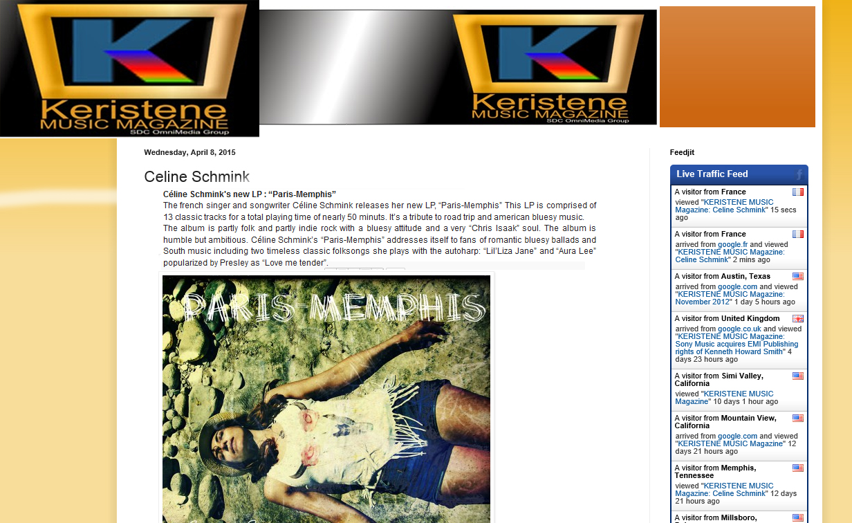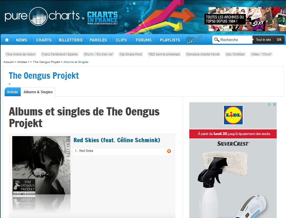 ACTUS du 22/04/2015 Céline est ce mois-ci dans le blog musical de Memphis Keristene Music Magazine et le single « Red skies » de The Oengus Projekt entre dans le magazine musical en ligne « Pure charts in France » !