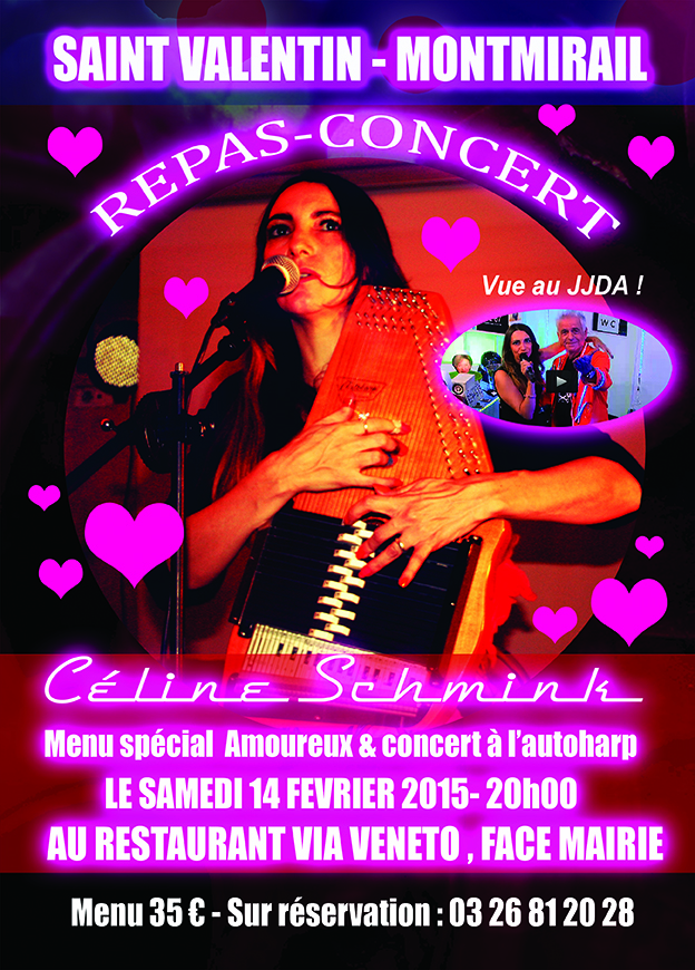 ACTU du 15/01/2015 Bonne année à tous ! Vous êtes de plus en plus nombreux à visiter ce site chaque jour ! Céline sera en concert le 14 février prochain au Via Veneto à Montmirail (51). Une superbe affiche vient de partir à l’imprimerie (voir ci-dessous). Attention, pensez à réserver !