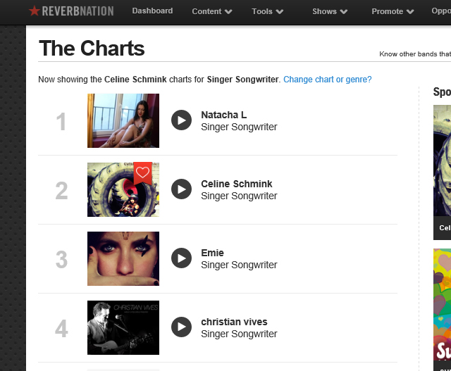 ACTU du 17/05/14 Céline Schmink est n° 2 aujourd’hui aux Charts Reverbnation catégorie Singer-Songwriter.