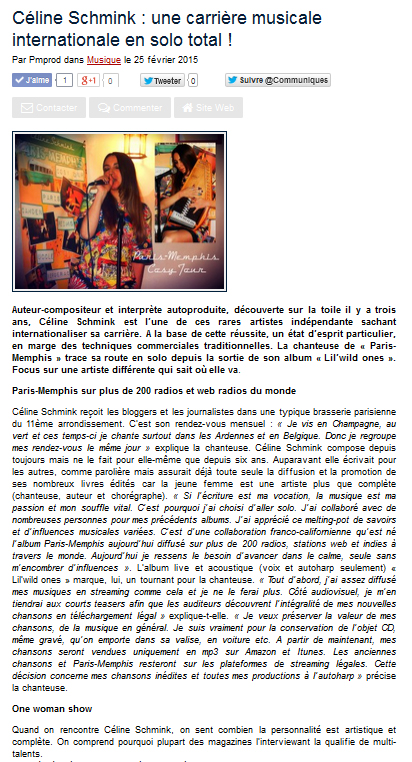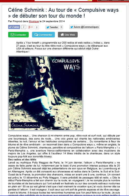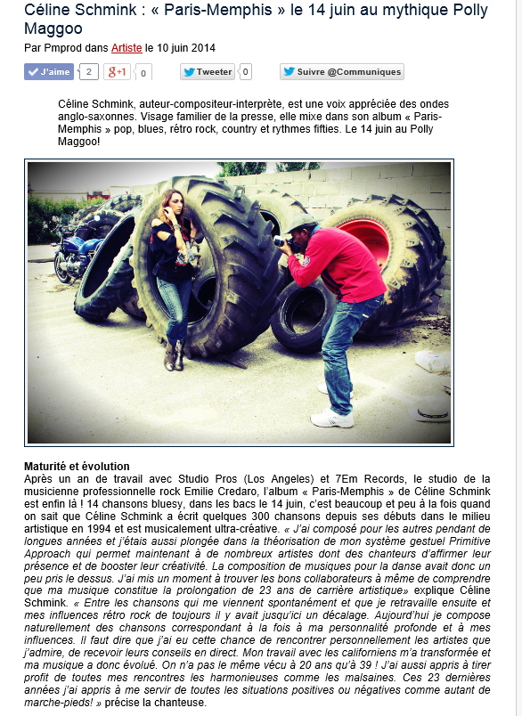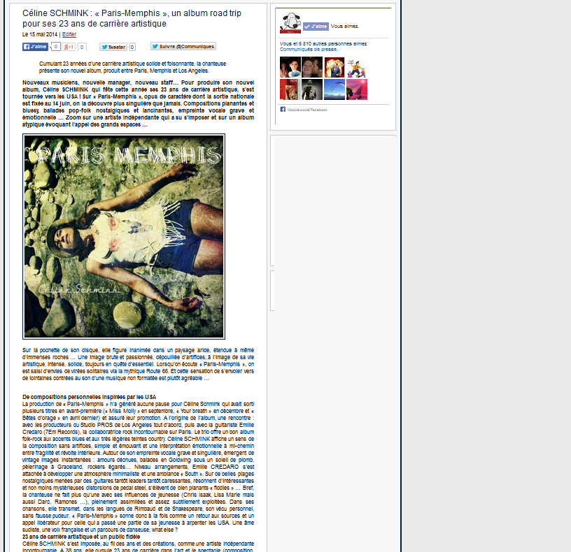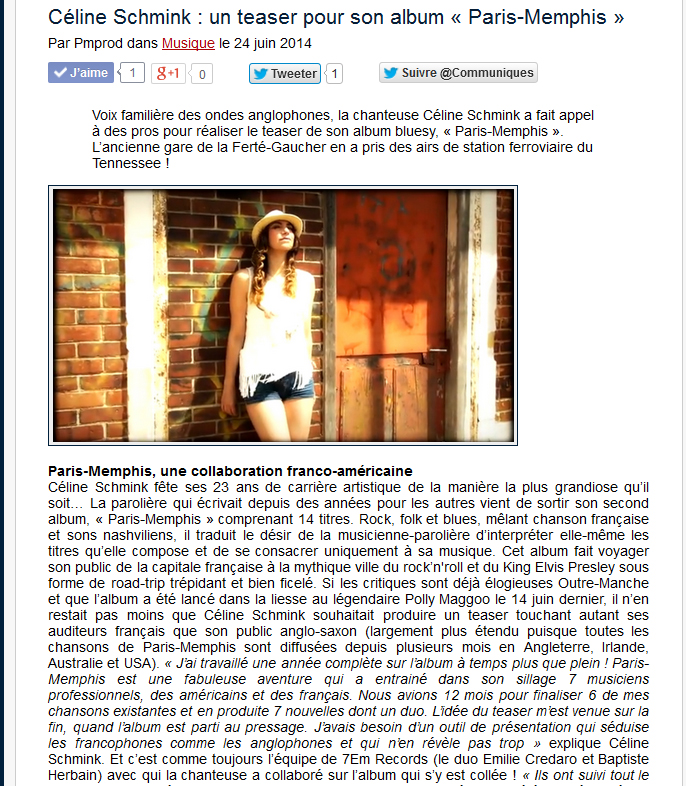 Pour les trois dernières années, les chroniques de chansons issues de l’album Paris-Memphis sont très nombreuses. Nous relayons ici certaines parutions Presse et Web. N’hésitez pas à nous signaler celles qui n’apparaitraient pas ! Les chroniques radiophoniques se trouvent sur la chaine officielle Youtube Céline Schmink. Les passages Télé et Radio se trouvent dans la rubrique « Actus ».
