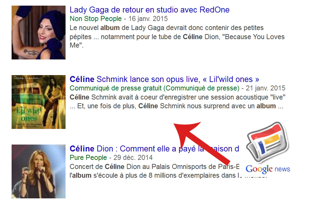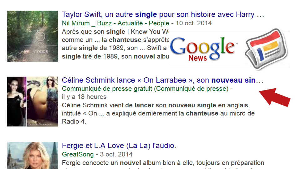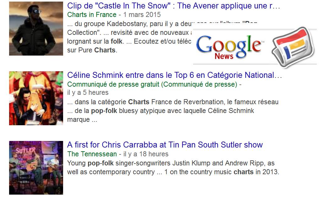 Le 02/04/2015 Céline est dans Google Actus ce jour. Elle y parle de sa 6eme place sur 210 compositeurs_interprètes dans les Charts nationaux Reverbnation !